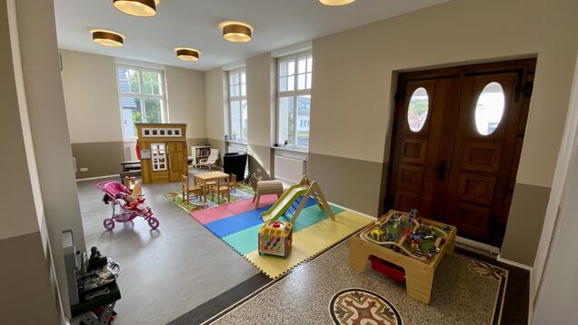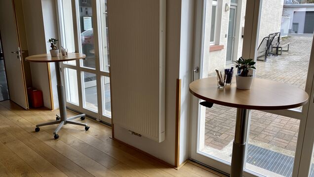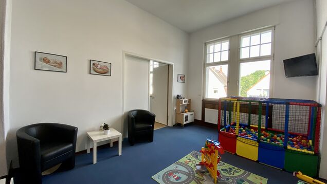 Garderobe, barrierefreie Toiletten, Tische, Stehtische, Stühle, Spielsachen, Bällebad.